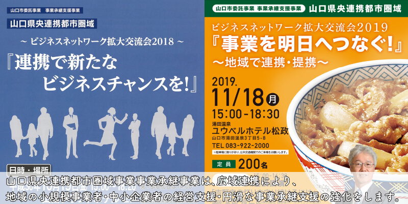 平成30年度より、山口市、宇部市、防府市の3商工会議所(山口、宇部、防府)と3商工会(山口県央、徳地、くすのき)で、連携協力提携を結び、事業業承継支援事業を広域で連携して実施してまいりました。